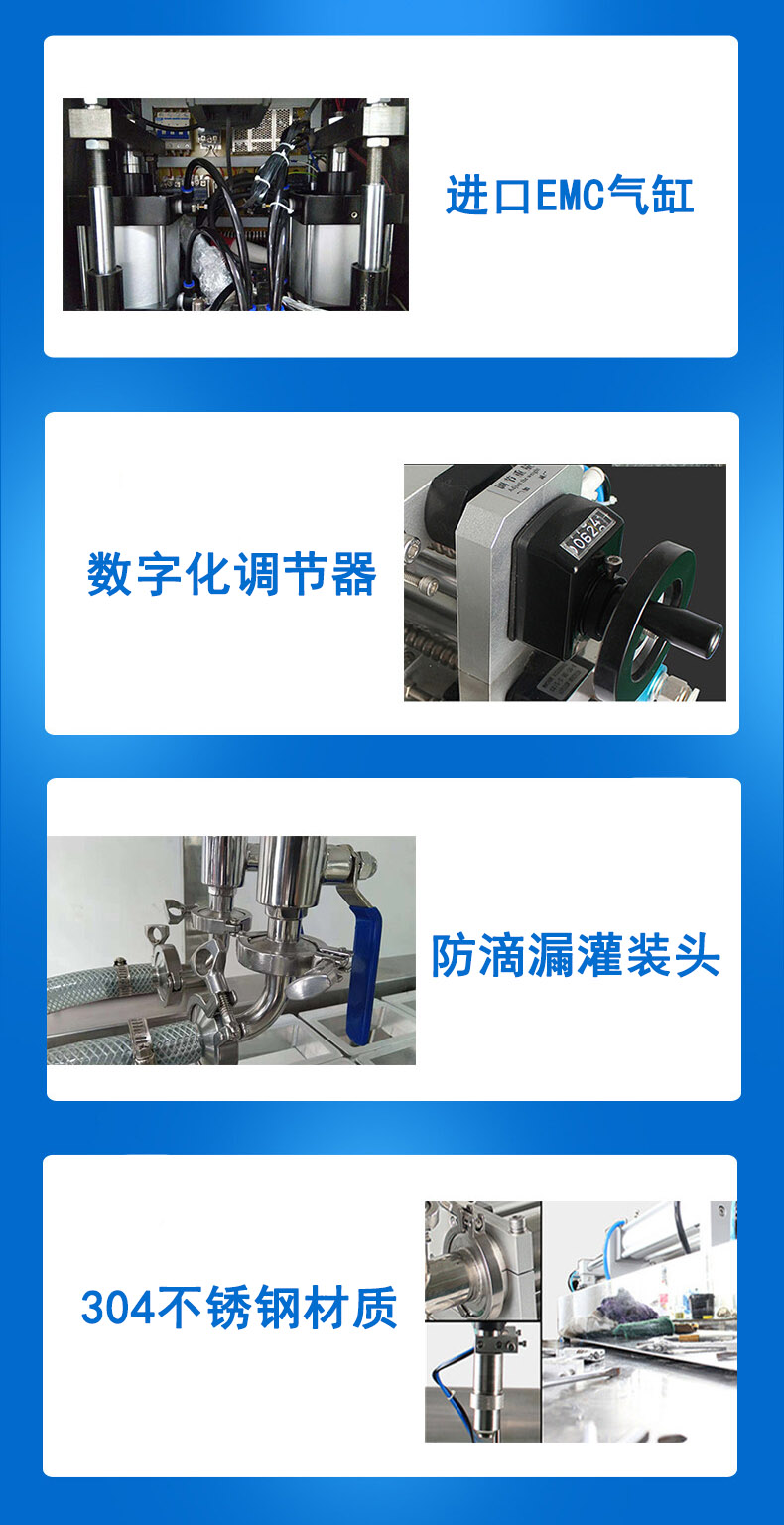 本機是針對餡料、醬料、果醬、糖漿等液體/膏體包裝精心設計的1-5L任意可調的新一代包裝設備。采用微電腦PLC自動控制、人機界面、全封閉、下潛式灌裝。計量精度高,灌裝范圍大,結構緊湊,運行平穩,適合于各種規則形狀的容器灌裝,液缸及其管道拆卸、清洗,方便快捷。