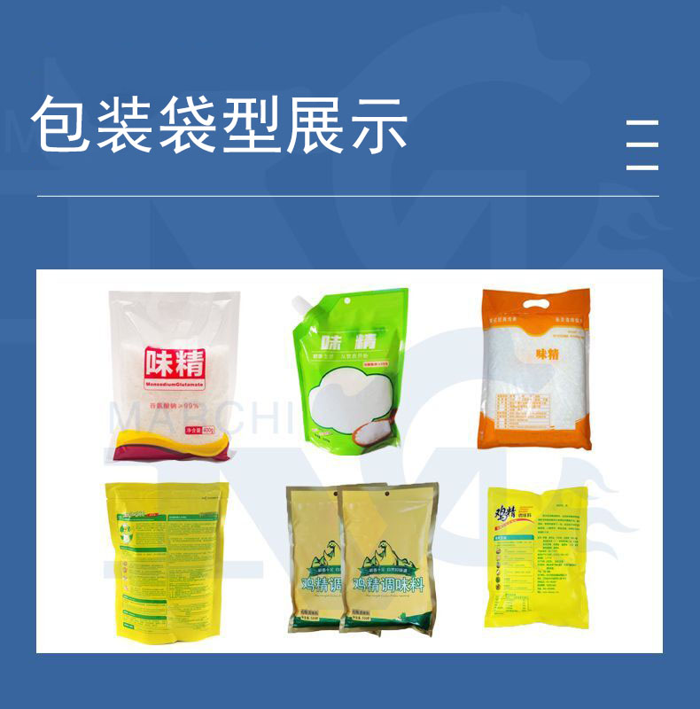 適用范圍:雞精、味精、白糖、食鹽、調味料、椒鹽等,可進行不同形式的產品包裝如下圖: